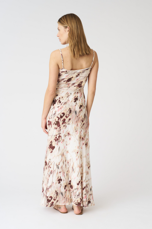 LIGHT BEIGE FLORAL PRINT LONG LINEN DRESS