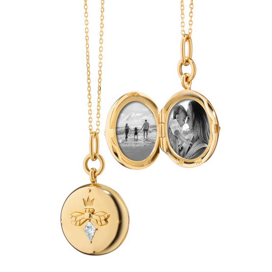 18K YELLOW GOLD ROUND BEE LOCKET WITH DIAMOND NECKLACE