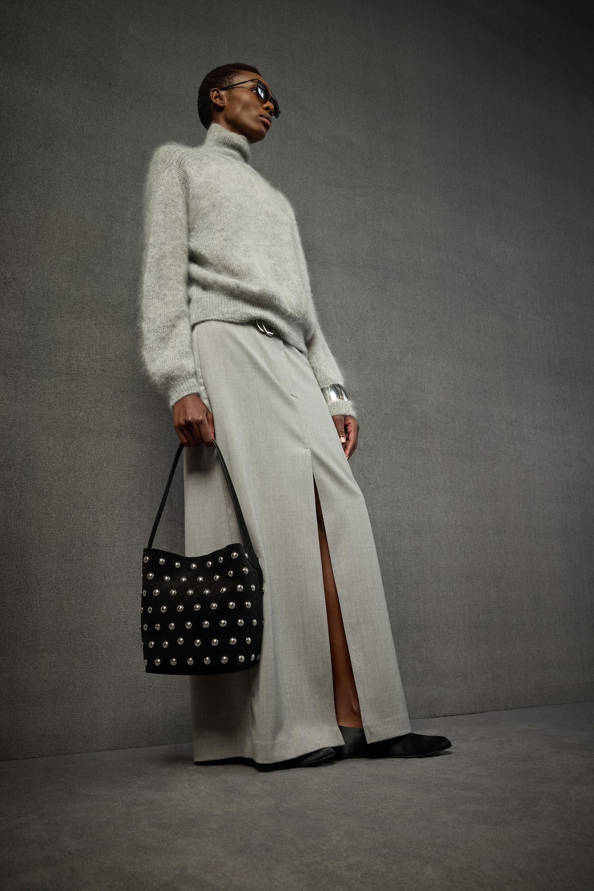 GREY MOHAIR HIGH-NECK SWEATER WITH SMALL IRIDESCENT SEQUINS. WIDE LONG SLEEVES WITH SNUG CUFFS AND ELASTICATED BOTTOM.