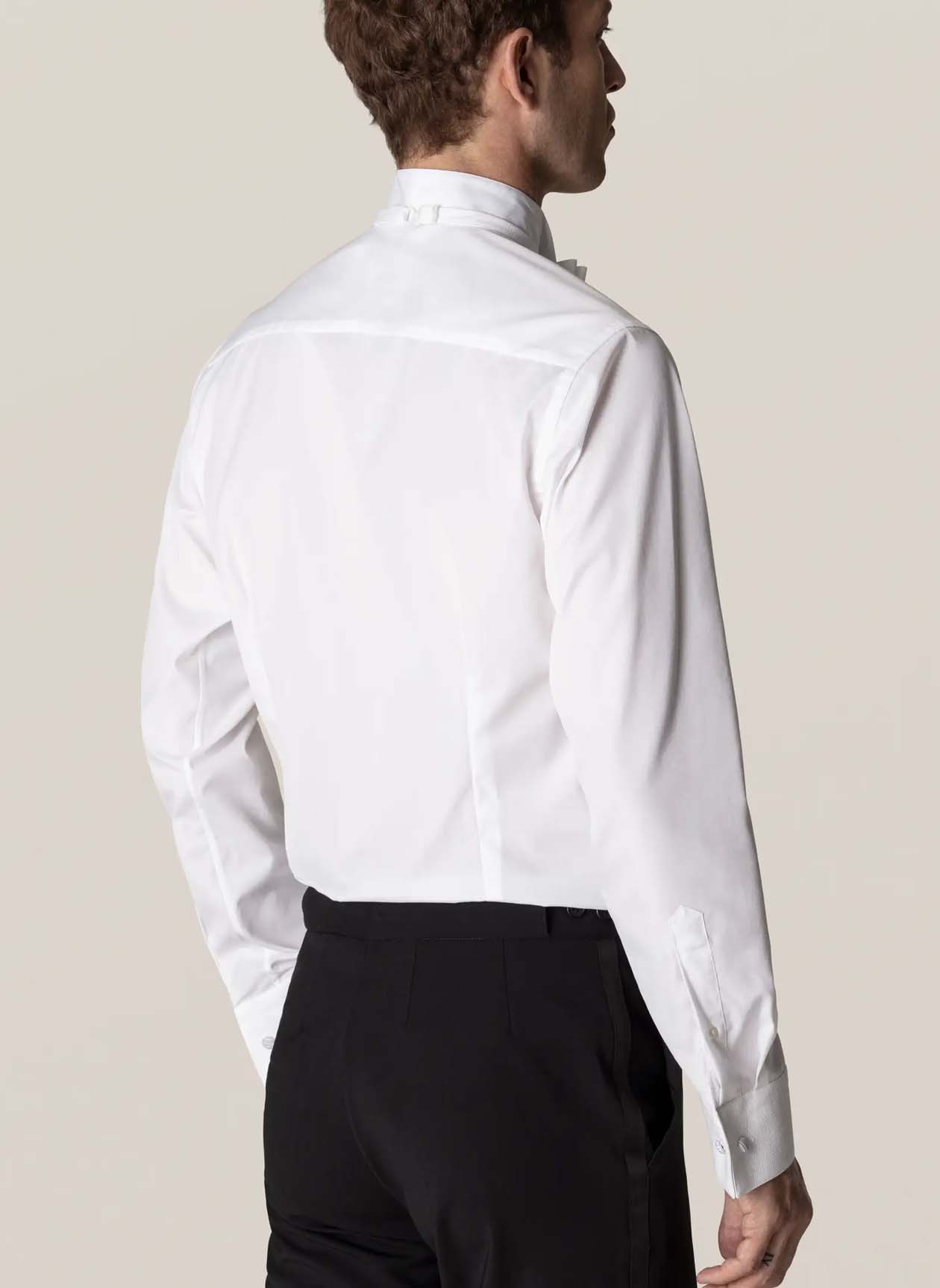 This elegant shirt with a pleated front is made for black-tie outfits. Cut from a plissé fabric, the shirt does not require ironing. A sophisticated wing collar, French cuffs, and black stud buttons create a timeless and elegant appearance. A sophisticated choice for suits and tuxedos.