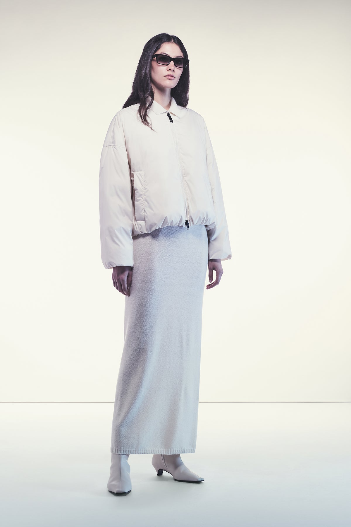 SHORT PADDED BOMBER JACKET IN MATT NYLON, WITH SHIRT COLLAR AND FRONT ZIP CLOSURE. SLIM-FIT SIDE POCKETS, ELASTICATED BOTTOM WITH DRAWSTRING AND WIDE SLEEVES WITH ELASTICATED CUFFS. LINED INSIDE.